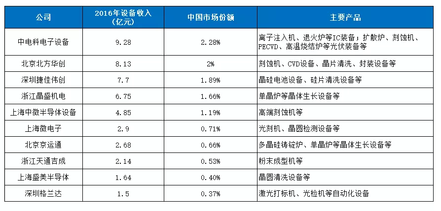 2016全国半导体设备十强 数据来源:中国半导体产业协会