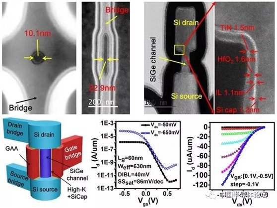 据介绍,朱慧珑课题组系统地研发了一种原子层选择性刻蚀锗硅的方法,结合多层外延生长技术将此方法用于锗硅/硅超晶格叠层的选择性刻蚀,从而精确地控制纳米晶体管沟道尺寸和有效栅长;首次研发出了垂直纳米环栅晶体管的自对准高k金属栅后栅工艺;其集成工艺与主流先进CMOS制程兼容。课题组最终制造出了栅长60纳米,纳米片厚度20纳米的p型VSAFET。原型器件的SS、DIBL和电流开关比(Ion/Ioff)分别为86mV/dec、40mV和1.8x105。